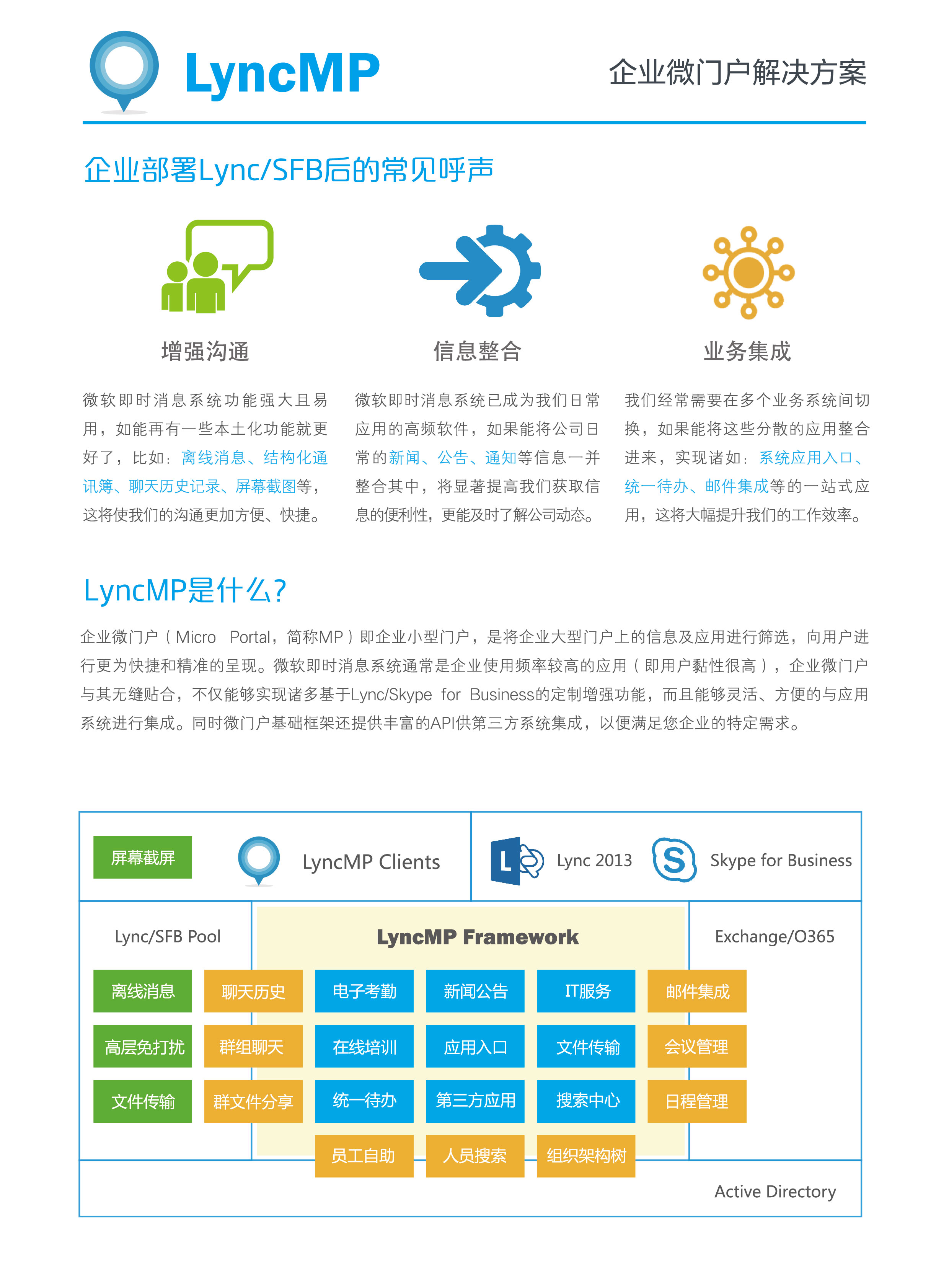 即时通讯系统通常是企业使用频率较高的应用(即用户黏性很高),我们推出的“LyncMP”与微软Lync即时通讯系统无缝贴合,为企业提供优质的微门户基础框架。